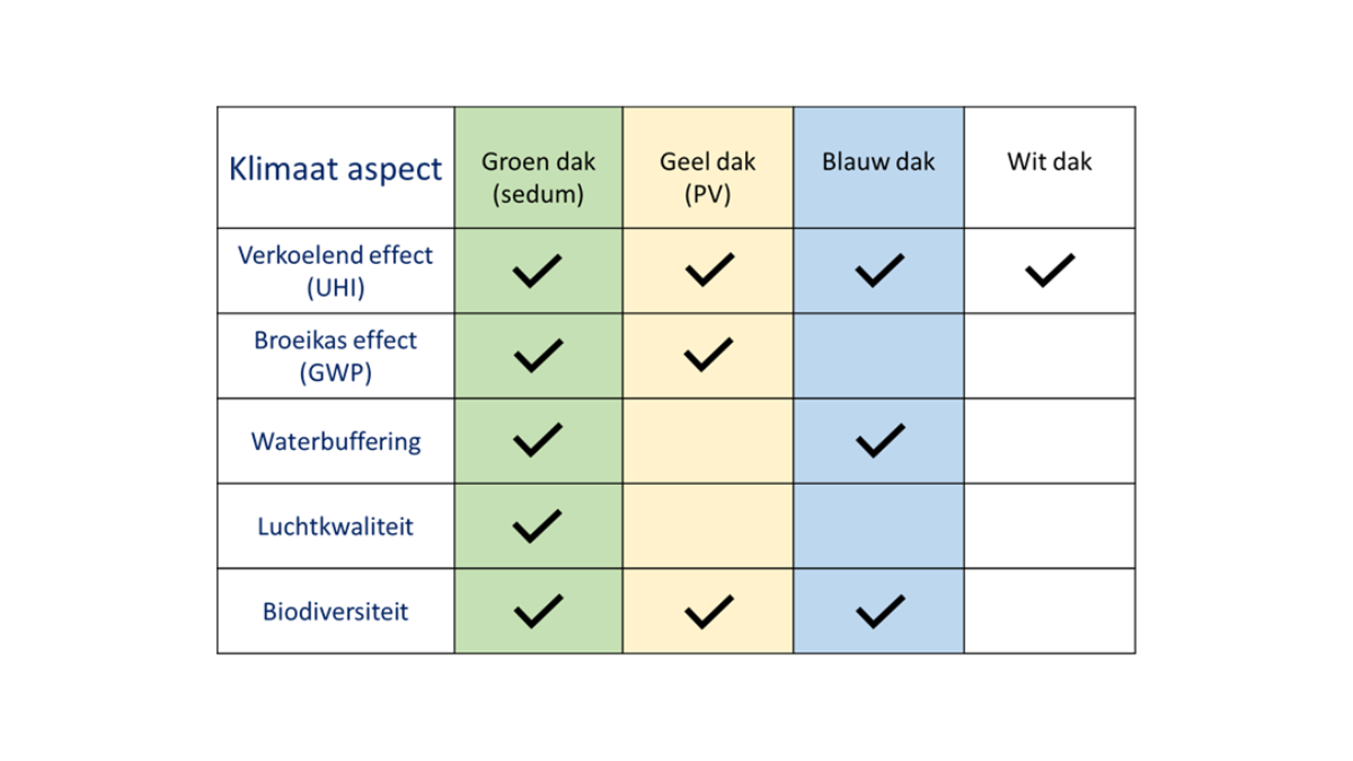 Met de figuur hiernaast wordt aangegeven voor welke klimaataspecten het rendement op de verschillende daken bepaald wordt.